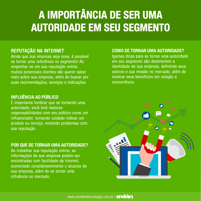 Ainda que sua empresa seja nova e você esteja iniciando na área, é possível se tornar uma referência no segmento! Ao empenhar-se em sua reputação online, muitos potenciais clientes vão querer saber mais sobre sua empresa, além de buscar por suas recomendações, serviços e indicações. Sendo assim, é importante lembrar que isso terá responsabilidades com seu público como um influenciador, tomando cuidado indicar um produto ou serviço, evitando problemas com sua reputação.Por que se tornar uma autoridade no segmento?