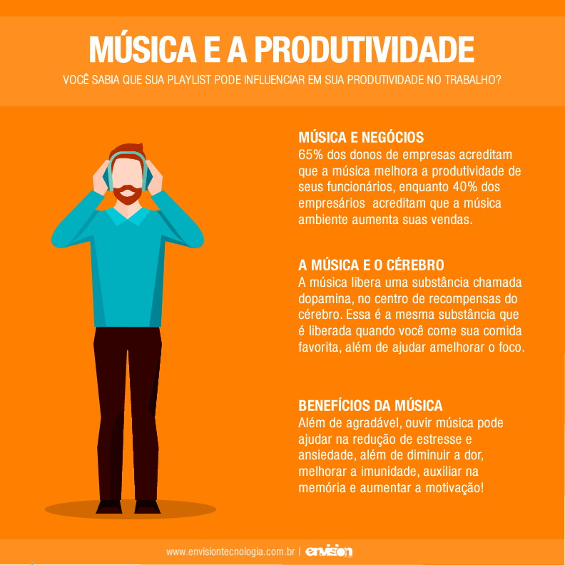 Você sabia que música ambiente ajuda da precisão de entrada de dados? Música clássica melhora em 12% e música pop reduz os erros em 14%. Além disso, música dançante aumenta a velocidade da leitura de revisão em até 20%! Apesar disso, músicas com letras podem atrapalhar a concentração na hora de aprender novas informações. O ideal é ouvir músicas já conhecidas se sua função exigir foco total!   E você, também trabalha ouvindo música? Se você gostou do artigo de hoje, confira também nosso texto sobre como melhorar sua produtividade em vendas   Deixe sua opinião nos comentários! Abraços e até a próxima. :)   Fonte: http://tutano.trampos.co/16842-infografico-musica-e-produtividade/