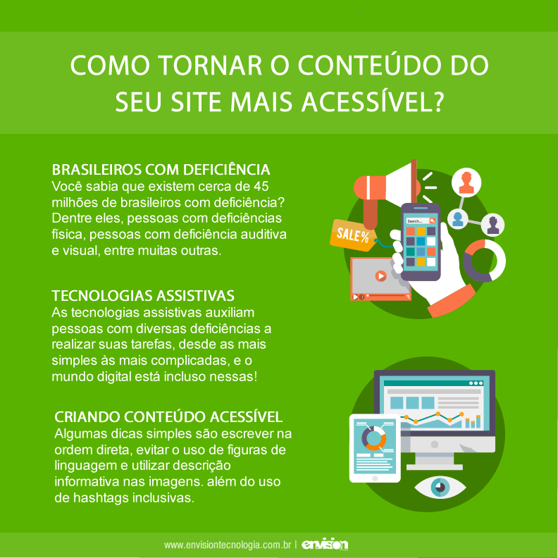 Como tornar o conteúdo de seu site mais acessível? Você já parou para pensar que pessoas com deficiência consomem o seu conteúdo? É provável que você nunca tenha se tocado disso, e hoje você vai entender porque produzir conteúdo acessível é tão importante, além de claro, aprender como deixar o conteúdo de seu site mais acessível! Brasileiros com deficiência Você sabia que existem cerca de 45 milhões de brasileiros com deficiência (dados do IBGE)? Nessa contagem se enquadram pessoas com mobilidade reduzida, deficiências físicas severas, pessoas com deficiência auditiva e visual, entre muitas outras, como intelectuais, cognitivas e múltiplas. O que são tecnologias assistivas? As tecnologias assistivas auxiliam pessoas... 30 de setembro de 2019 Master Administrador Marketing 0 comentários Deixe um comentário Cancelar respostaO seu endereço de e-mail não será publicado. Campos obrigatórios são marcados com * Salvar meus dados neste navegador para a próxima vez que eu comentar.