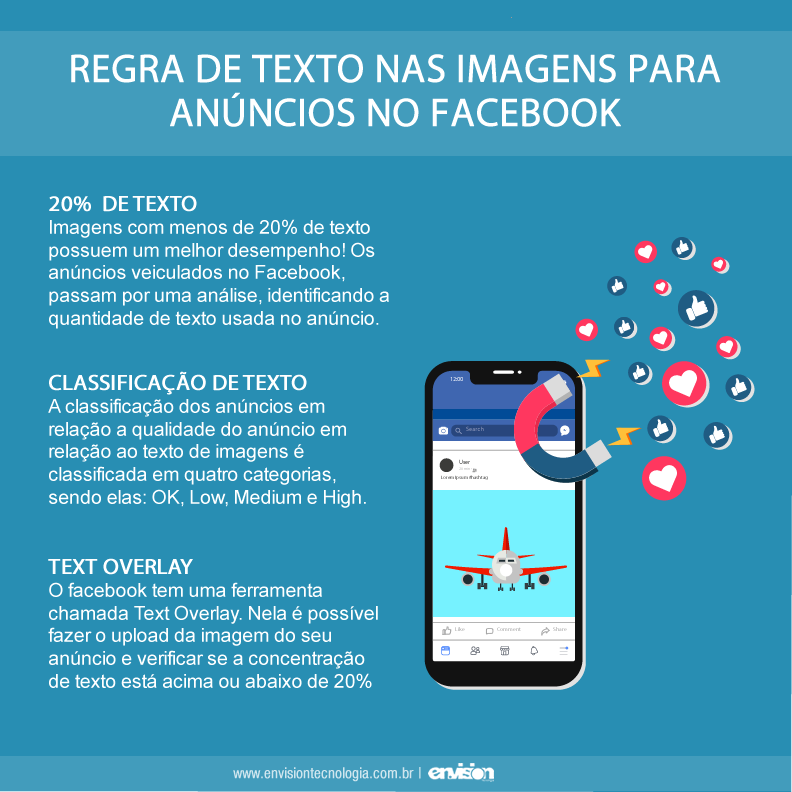 Você conhece a regra de texto nas imagens para anúncios no Facebook? Muita gente se engana ao achar que para ter sucesso nas mídias sociais basta anunciar! Para cada canal, o modelo é diferente e precisa ser otimizado para gerar maiores resultados. Hoje vamos falar de como anunciar no Facebook, especificamente da regra de 20% de texto nessa plataforma. A regra dos 20% Essa regra diz respeito aos textos contidos nas imagens dos anúncios. O Facebook percebeu que imagens com menos de 20% de texto possuem um melhor desempenho! Assim, para oferecer uma melhor experiência ao usuário, os anúncios veiculados no Facebook e Instagram passam por um processo de análise, identificando a... 8 de outubro de 2019 Master Administrador Marketing 0 comentários Deixe um comentário Cancelar respostaO seu endereço de e-mail não será publicado. Campos obrigatórios são marcados com * Salvar meus dados neste navegador para a próxima vez que eu comentar.
