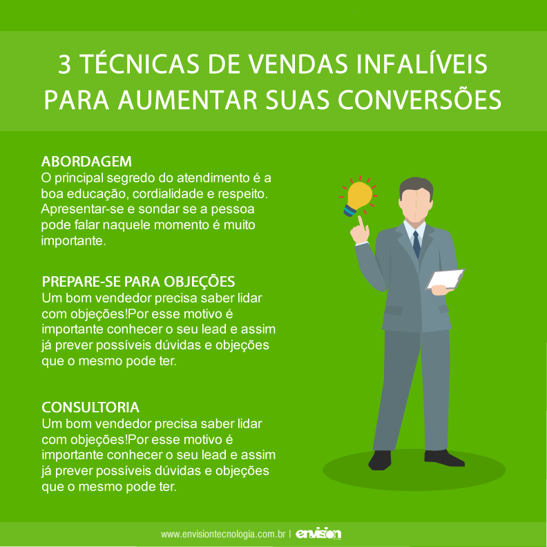 Para ter um bom índice de vendas, é necessário muito esforço e prática para atingir as metas definidas. Sendo assim, no artigo de hoje trouxemos algumas técnicas de vendas que irão te ajudar a conquistar seus objetivos! Abordagem Vamos a uma situação comum: quantas vezes um vendedor já tentou te ofereceu um produto, você falou que não tinha interesse e o contato se encerrou aí? Provavelmente isso já aconteceu contigo e você com certeza não quer que o mesmo se repita em sua empresa. O principal segredo do atendimento é a boa educação, cordialidade e respeito. Apresentar-se e sondar se...