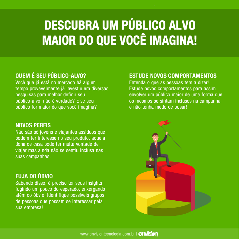 Descubra um público-alvo maior do que você imagina! Você sabia que seu público-alvo pode ser maior do que você imagina? No artigo de hoje vamos falar um pouco sobre isso, confira! Quem é seu público-alvo? Você que já está no mercado há algum tempo provavelmente já investiu em diversas pesquisas para melhor definir seu público-alvo, não é verdade? E se eu te disser que seu público pode ser muito maior do que você imagina? Não são só jovens e viajantes assíduos que podem ter interesse no seu produto, aquela dona de casa pode ter muita vontade de viajar mas ainda não se sentiu inclusa nas suas campanhas. Um... 7 de novembro de 2018 Master Administrador Marketing 0 comentários Deixe um comentário Cancelar respostaO seu endereço de e-mail não será publicado. Campos obrigatórios são marcados com * Salvar meus dados neste navegador para a próxima vez que eu comentar. O período de verificação do reCAPTCHA expirou. Por favor, recarregue a página.