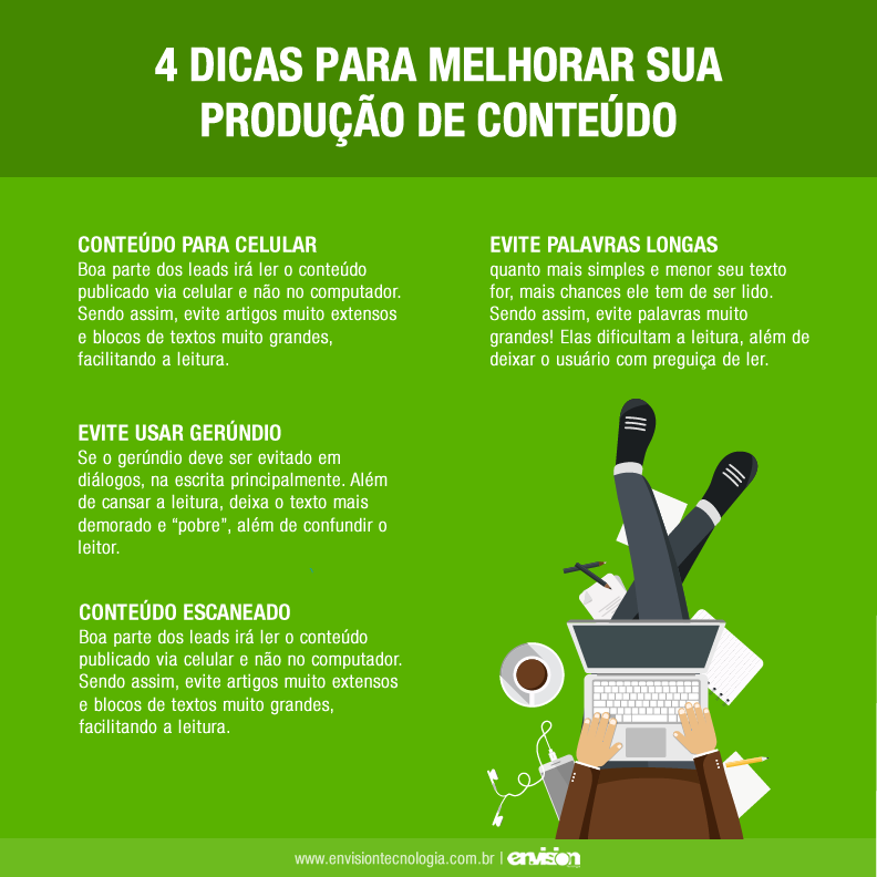 4 dicas para melhorar sua produção de conteúdo Sempre falamos aqui no blog da importância de disponibilizar conteúdo gratuito para seus potenciais clientes, mas como está a qualidade dos artigos? No post de hoje vamos trouxemos algumas dicas para melhorar a qualidade do conteúdo! Conteúdo para celular Boa parte dos leads irá ler o conteúdo publicado via celular e não no computador. Sendo assim, evite artigos muito extensos e blocos de textos muito grandes, facilitando a leitura. Lembre-se que se no computador um parágrafo tem quatro linhas, no celular viram oito! Evite usar gerúndio Se o gerúndio deve ser evitado em diálogos, na escrita principalmente. Além de cansar... 6 de abril de 2018 Master Administrador Marketing 0 comentários Deixe um comentário Cancelar respostaO seu endereço de e-mail não será publicado. Campos obrigatórios são marcados com * Salvar meus dados neste navegador para a próxima vez que eu comentar. O período de verificação do reCAPTCHA expirou. Por favor, recarregue a página.
