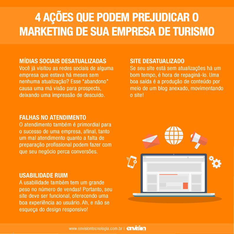 4 ações que podem prejudicar o marketing de sua empresa de turismo Sempre trazemos no blog dicas do que fazer para melhorar sua estratégia de marketing, mas e o que não fazer? Em nosso artigo de hoje vamos falar sobre quatro ações que você deve evitar em sua empresa de turismo! 1 - Mídias sociais desatualizadas Você já visitou as redes sociais de alguma empresa que estava há meses sem nenhuma atualização? Esse “abandono” causa uma má visão para prospects e clientes, deixando uma impressão de descuido. 2- Falhas no atendimento O atendimento também é primordial para o sucesso de uma empresa, afinal, tanto um mal atendimento quanto a falta de preparação... 9 de abril de 2018 Master Administrador Marketing 0 comentários Deixe um comentário Cancelar respostaO seu endereço de e-mail não será publicado. Campos obrigatórios são marcados com * Salvar meus dados neste navegador para a próxima vez que eu comentar. O período de verificação do reCAPTCHA expirou. Por favor, recarregue a página.
