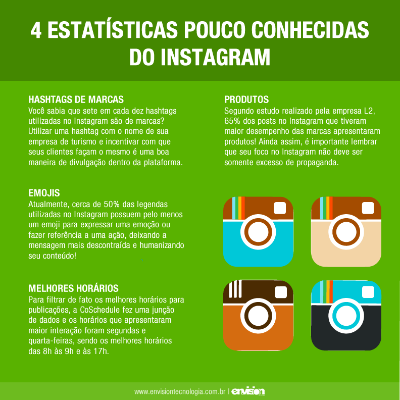4 estatisticas pouco conhecidas do Instagram Já falamos diversas vezes aqui no blog que o Instagram é uma das ferramentas essenciais para sua empresa de viagens. Primeiro, porque essa ferramenta possui um engajamento maior que o Facebook e além disso, por ter seu foco na divulgação de imagens, fazer com que um potencial cliente se apaixone por um destino, o Instagram se torna essencial! Pensando nisso, no artigo de hoje trouxemos algumas estatísticas menos conhecidas da plataforma que irão ajudar a otimizar o Instagram de sua agência de viagens! 1- Hashtags de marcas! As hashtags funcionam como categorias dentro do Instagram, e ao adicionar uma... 7 de julho de 2017 Master Administrador Outros 0 comentários Deixe um comentário Cancelar respostaO seu endereço de e-mail não será publicado. Campos obrigatórios são marcados com * Salvar meus dados neste navegador para a próxima vez que eu comentar. O período de verificação do reCAPTCHA expirou. Por favor, recarregue a página.
