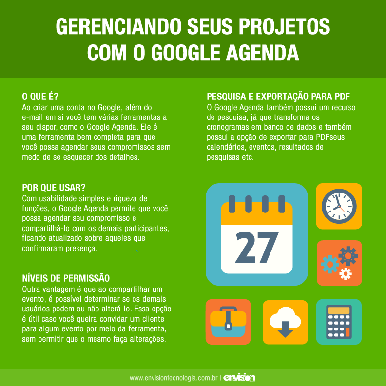 Gerenciando seus projetos com o Google Agenda Como você organiza os seus compromissos no trabalho? Reuniões, apresentações para clientes, e outros eventos? Às vezes parece muita coisa para armazenar, não é mesmo? Você conhece ou já usou o Google Agenda? No post de hoje vamos falar dessa ferramenta totalmente gratuita que vai ajudar muito no seu planejamento diário e não apenas no agendamento de compromissos! O que é? Ao criar uma conta de e-mail no Google, além do e-mail em si você tem várias ferramentas a seu dispor, como o Google Drive, Planilhas, Documentos e também o Google Agenda. Ele é uma ferramenta extremamente completa para... 28 de setembro de 2016 Master Administrador Marketing, Tecnologia 0 comentários